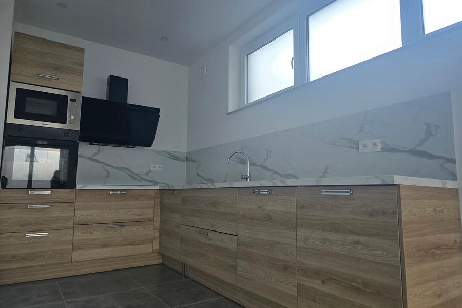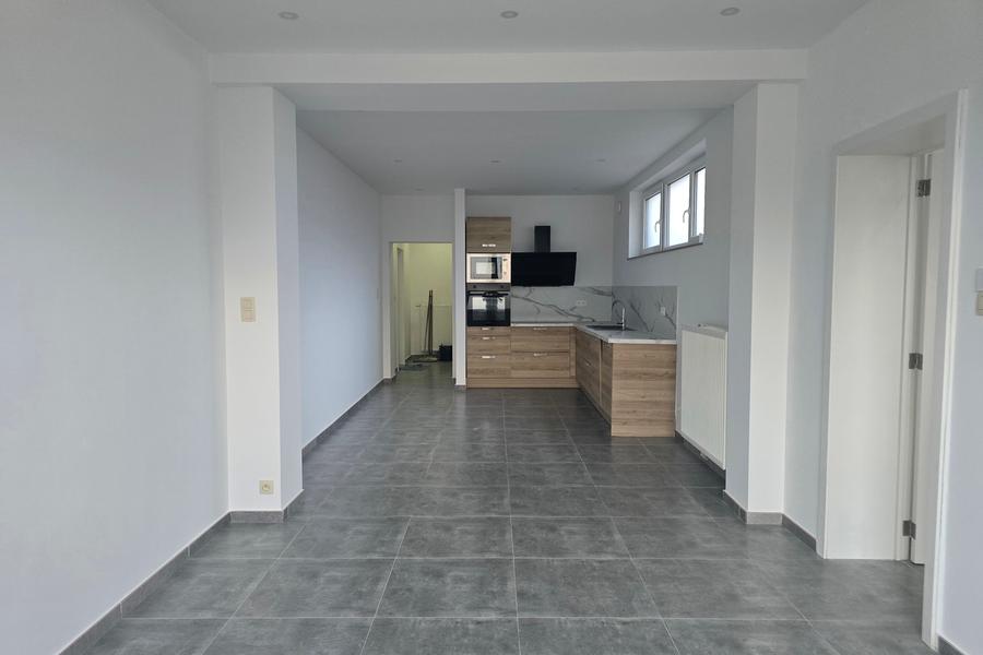 Il se compose d’un hall d’entrée, d’un séjour (salon–salle à manger) avec cuisine ouverte et équipée, de deux chambres, d’une salle de douche, d’un WC séparé et d’une buanderie.