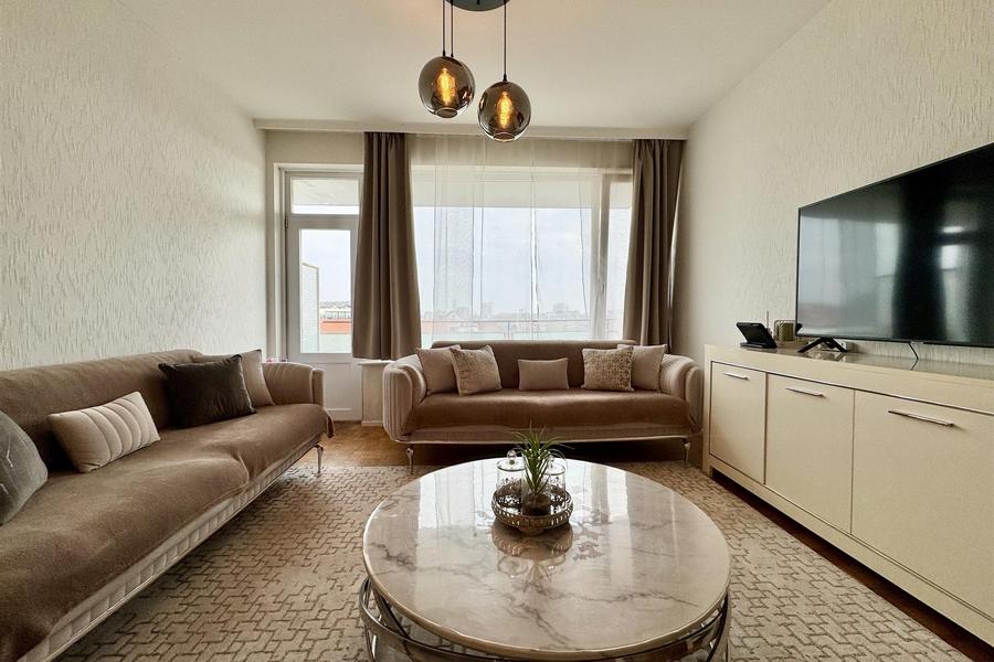 L'appartement comprend trois chambres de taille normale, idéales pour les familles, un bureau à domicile ou une salle de loisirs. Le salon spacieux est baigné de lumière et offre un espace de vie ouvert et agréable avec une vue imprenable sur l'impressionnante ligne d'horizon d'Anvers. À côté se trouve une cuisine séparée, entièrement équipée et dotée de tout le confort moderne. La salle de bains est équipée d'une baignoire, idéale pour se détendre après une journée bien remplie.
