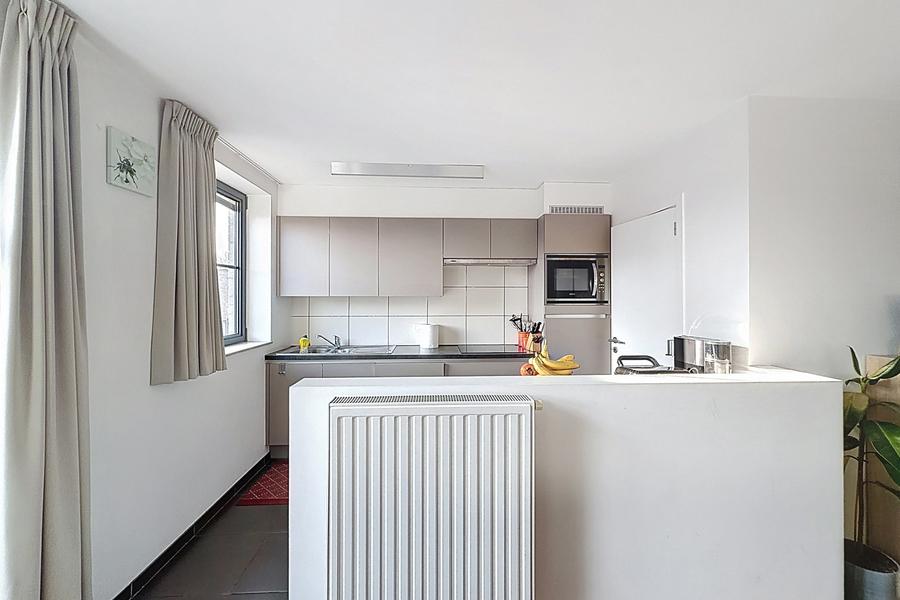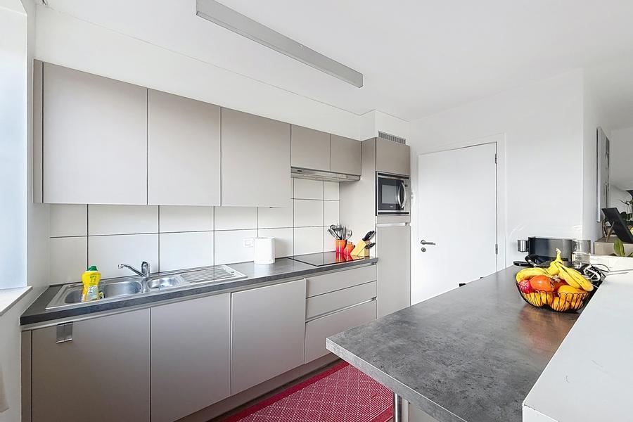 La cuisine équipée (7 m²) comprend tout le nécessaire : taques, hotte, lave-vaisselle, four à micro-ondes et réfrigérateur, le tout dans un aménagement moderne et fonctionnel.