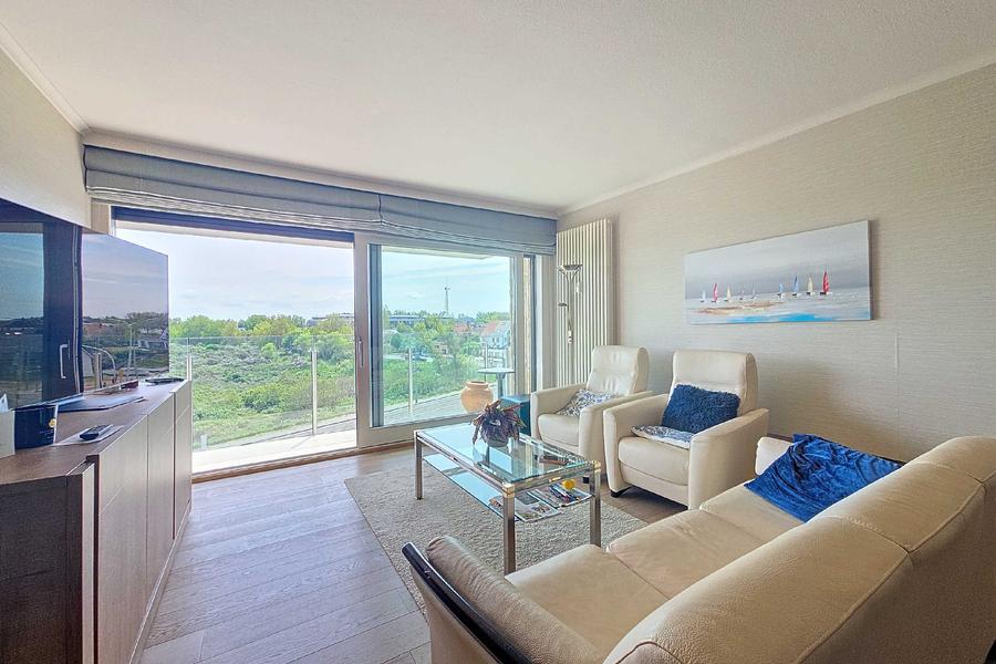 Un appartement spacieux et lumineux rénové en 2015 avec une vue imprenable sur les dunes et situé au centre de Nieuport-Bain, à deux pas de la plage, de la mer, de divers magasins et des transports en commun.Disposition: hall d'entrée avec possibilité dun coin couchage, séjour avec cuisine ouverte et équipée, accès à la terrasse spacieuse orientée au sud, 1 chambre à coucher avec armoire encastrée, salle de bain avec douche à l'italienne, vasque simple et toilette.