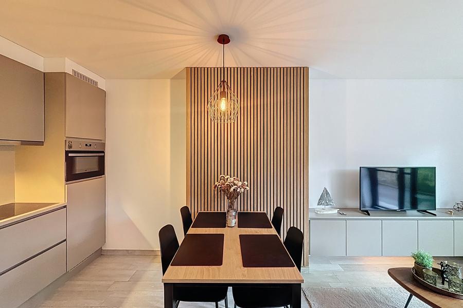 Superbe appartement meublé au rez-de-chaussée, prêt à emménager, situé au bord du canal à Nieuport, au calme mais à proximité de tout. L'appartement a été aménagé soigneusement et avec une attention particulière pour les détails et la qualité.Disposition: hall d'entrée avec toilettes invités et débarras séparé, un salon lumineux avec cuisine ouverte et un accès direct à la grande terrasse ensoleillée, deux chambres donnant sur la terrasse et une salle de bain avec douche à l'italienne.L'appartement est vendu avec un débarras privé et une place de shuttle souterraine (adaptée aux vélos, cyclomoteurs, etc.).De plus, le bâtiment dispose d'un local à vélos commun. Idéal comme résidence permanente, résidence secondaire ou investissement.