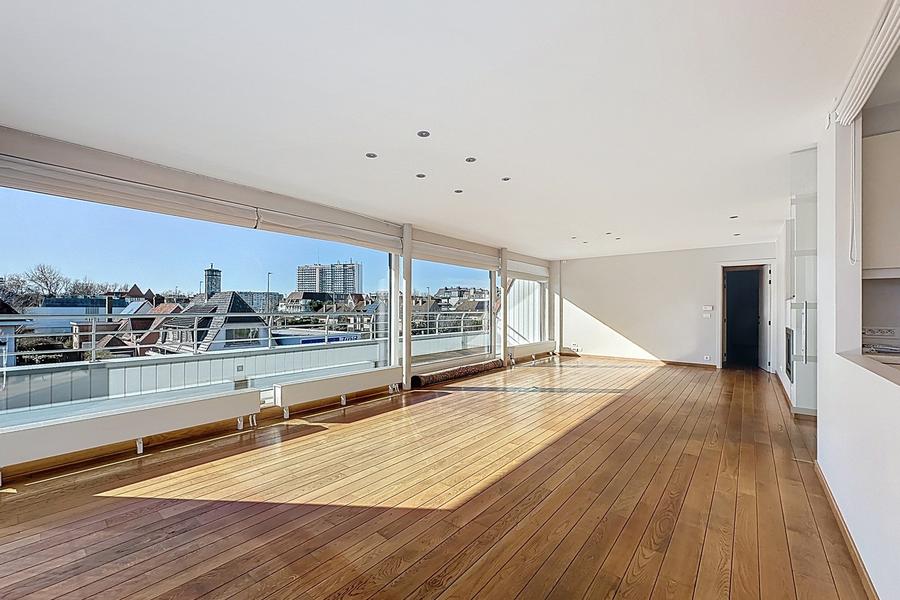 Appartement d’angle exceptionnel (trois façades) de 124 m² avec grande terrasse ensoleillée (26,75 m²), situé à proximité immédiate de la mer, des dunes et du centre animé d’Oostduinkerke-Bad. Vous y profitez d’un équilibre parfait entre calme et dynamisme.Le vaste séjour lumineux avec feu au gaz dégage une atmosphère chaleureuse et s’ouvre directement sur la terrasse d’angle orientée sud-ouest offrant une vue dégagée – un endroit idéal pour se détendre. Les screens solaires assurent un confort et une intimité supplémentaires. La cuisine ouverte, entièrement équipée avec des appareils de qualité, communique avec un espace de rangement pratique. L’appartement comprend également deux chambres particulièrement spacieuses, dont l’une peut facilement être divisée afin de créer une troisième chambre, une salle de bains confortable avec double lavabo, bain à bulles et deuxième toilette, ainsi qu’une salle de douche séparée avec douche à l’italienne. Les parquets apportent une touche chaleureuse et élégante à l’ensemble.Un garage box très spacieux (3,55 m x 11,95 m) et une grande cave privative peuvent être acquis séparément.Un bien de standing offrant de beaux volumes, idéal comme résidence principale ou comme seconde résidence en bord de mer.