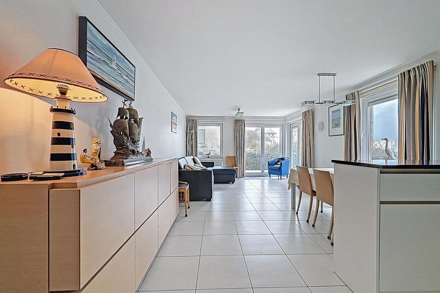 Bel appartement de coin avec très bonne situation, près de la plage et du KYC et près du centre de Saint-Idesbald. L'appartement a vue sur les dunes et Mieke Hill et comprend: entrée, living et salle à manger qui donnent sur la grande terrasse ensoleillée (30m) , cuisine équipée, deux chambres, wc, SDB, débarras. Double cave privative. Possibilité d'acquérir un emplacement (43.000 euro). Possibilité d'acquérir les meubles. Réf. Herman Teirlinck 0102