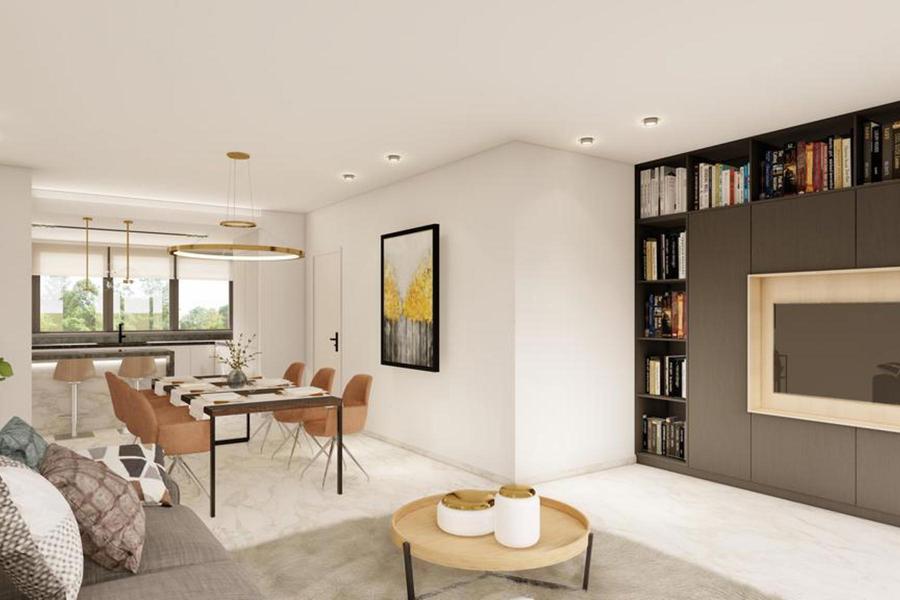 Rez-de-chaussée : hall d’entrée, salle de bain, WC, chambre de ±20 m² avec dressing et accès jardin + terrasse (±10 m²), garage (±15 m²)