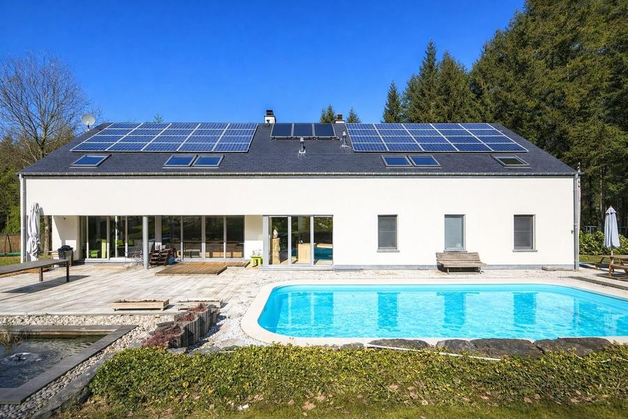 Plus prosaïquement, 42 panneaux Photovoltaïques, isolation 20 cm, DV alu laqué, cc sol, poêle de masse, conso d’énergie ridicules, toit en ardoises naturelles, murs en béton cellulaire, marbres, domotique placards.