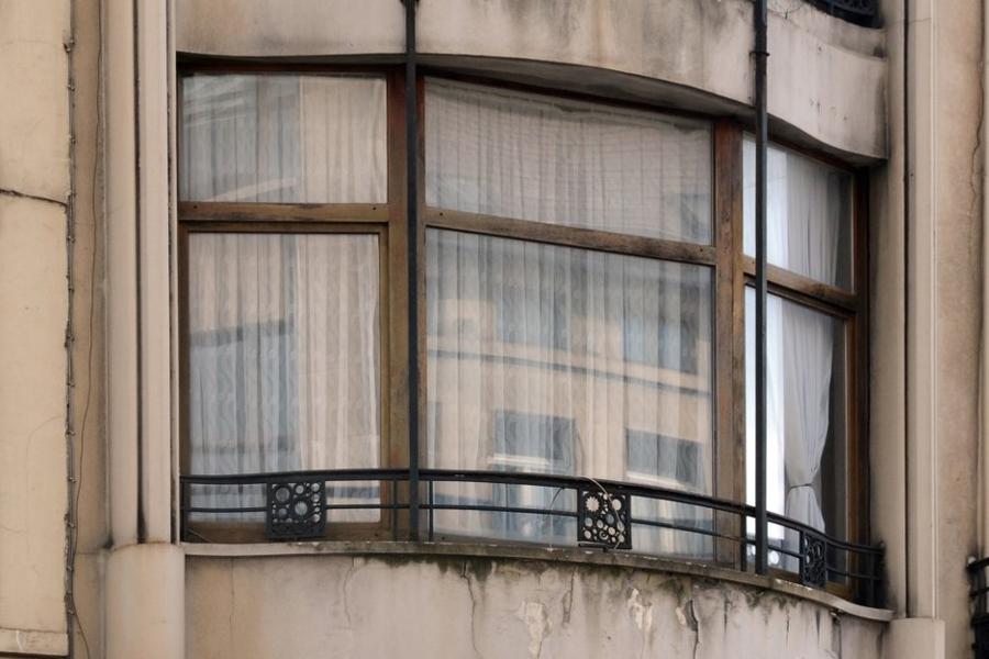 Composition asymétrique enduite en simili-pierre blanche. Baies à encadrement à ressauts, porte sous balconnet formant auvent et fenêtres jumelles au rez-de-chaussée. Bow-window de plan chantourné sous terrasse, avec assise et cul-de-lampe cannelés précédant un pilastre à tores. Porte vitrée, garde-corps et barres d’appui en fer forgé à motifs de cercles et volutes ; montants métalliques reliant les éléments du bow-window.