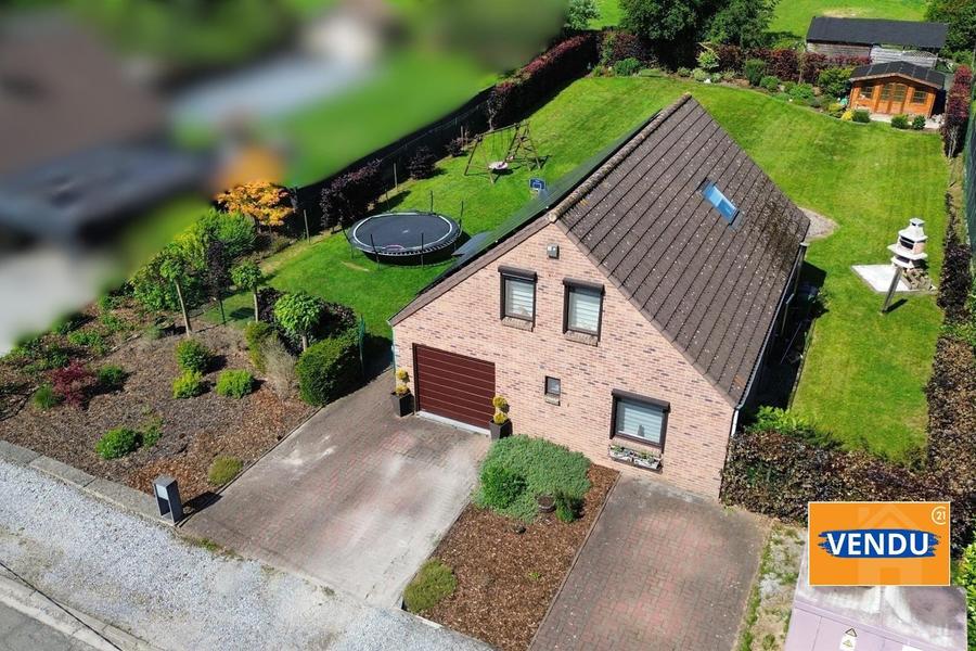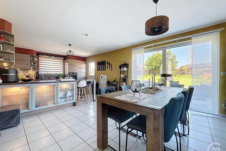 Elle offre un spacieux et lumineux séjour, une salle à manger, une cuisine super équipée, une salle de bains, une salle de douches, un WC séparé, ainsi que trois belles chambres. Un garage complète l'ensemble, le tout sur un terrain arboré de 10 ares 72 ca.
