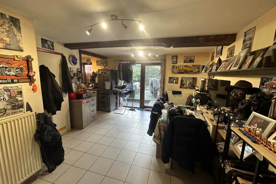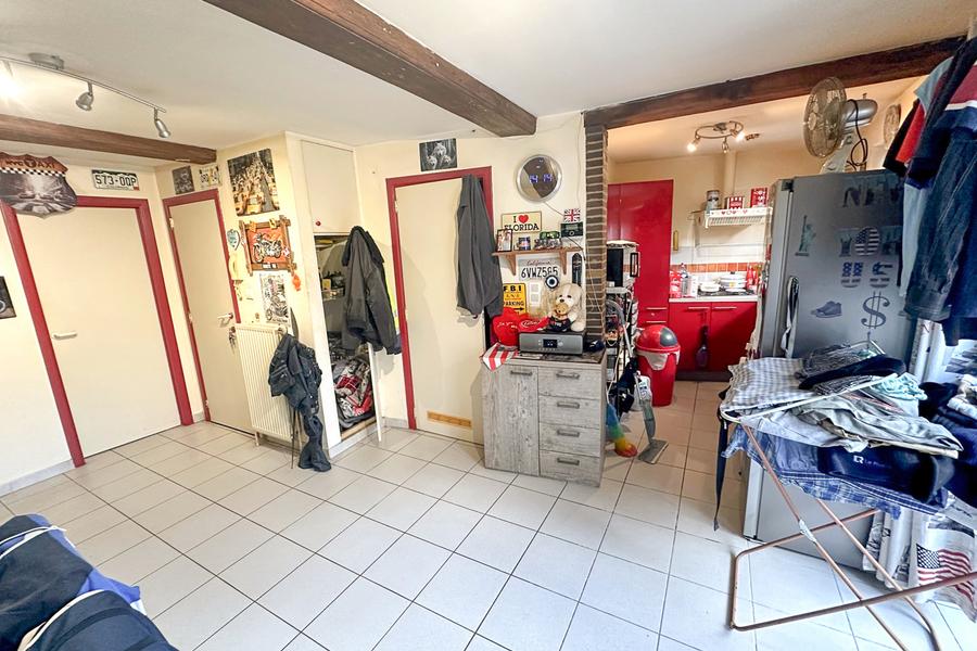 Le rez accueille un appartement d’environ 50 m² comprenant un séjour avec cuisine ouverte, une chambre, une salle de bains et un accès vers une petite remise arrière. Il y a également un jardin. Le chauffage est assuré par une chaudière gaz (Vaillant Ecotec Plus), double vitrage châssis bois. Le logement est actuellement loué à 470 € + 75€ de charges.