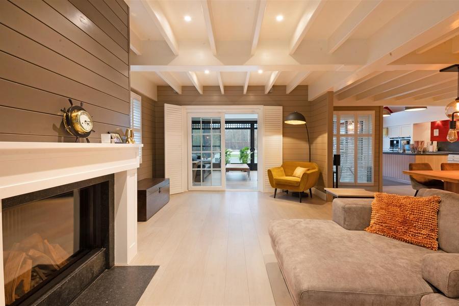 Avec la cuisine ouverte et entièrement équipée, l'espace de vie spacieux et lumineux constitue le cœur de la maison. A côté se trouve l'élégante véranda, un espace de vie à part entière, agréable toute l'année grâce à la climatisation et offrant une belle vue sur le jardin.