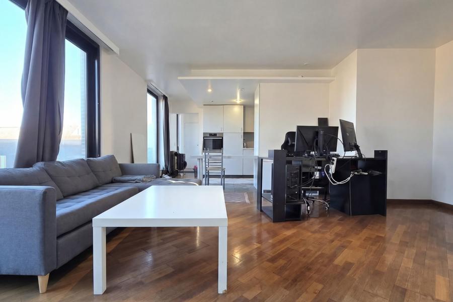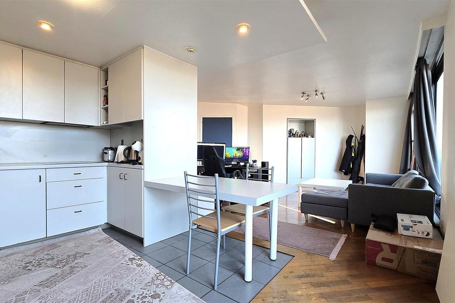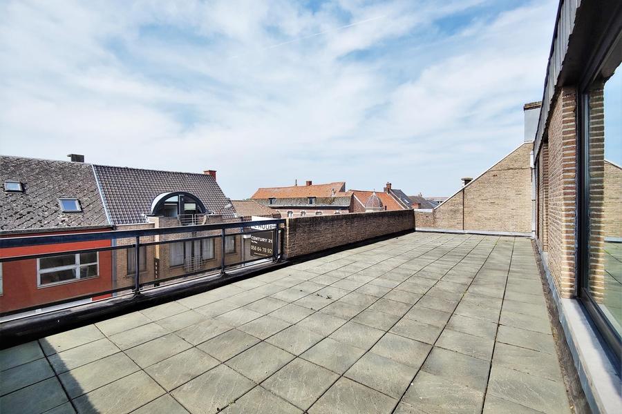 Op de bovenste verdieping van deze kleinschalige residentie met 3 appartementen, vind je op de 3e verdieping dit lichtrijk dakappartement met een heel groot terras aan de voorzijde (avondzon) en een volwaardig terras aan de achterzijde (ochtend- en middagzon). Via de lift kom je aan in het appartement. De inkom met apart toilet (wordt nog vernieuwd) heeft uit op de halfopen keuken met aangebouwde eettafel. Een lichtrijke leef- en eethoek met zicht op het terras aan de voorzijde maken het leuk vertoeven. De achterliggende slaapkamer met ingebouwde kasten sluit hierop aan. De badkamer grenst aan de slaapkamer en werd recent vernieuwd. Aan de slaapkamer grenst het zonnige 2e terras aan de achterzijde.