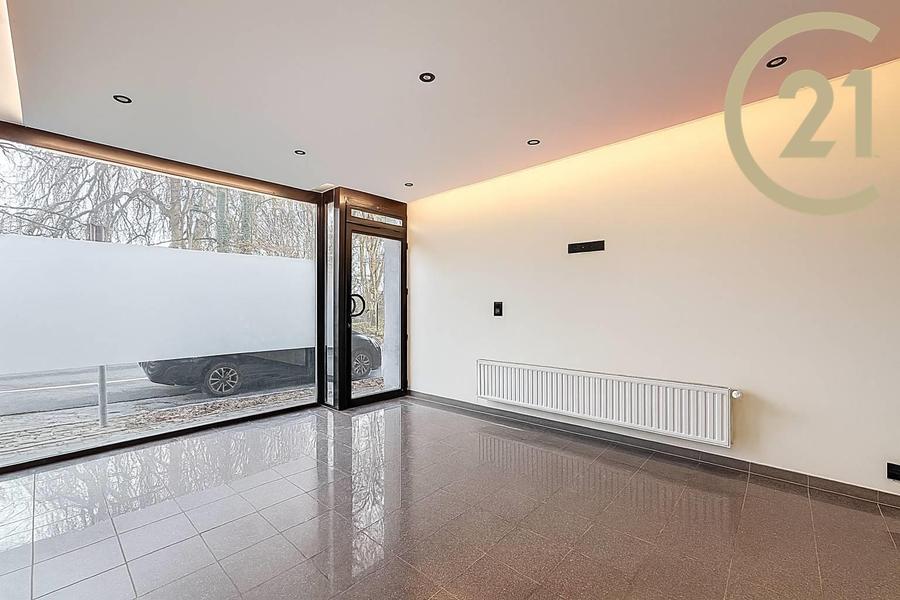 De glazen voorgevel biedt een uitstekende zichtbaarheid, baadt het interieur in natuurlijk licht en creëert een aangename sfeer die bevorderlijk is voor het werk.