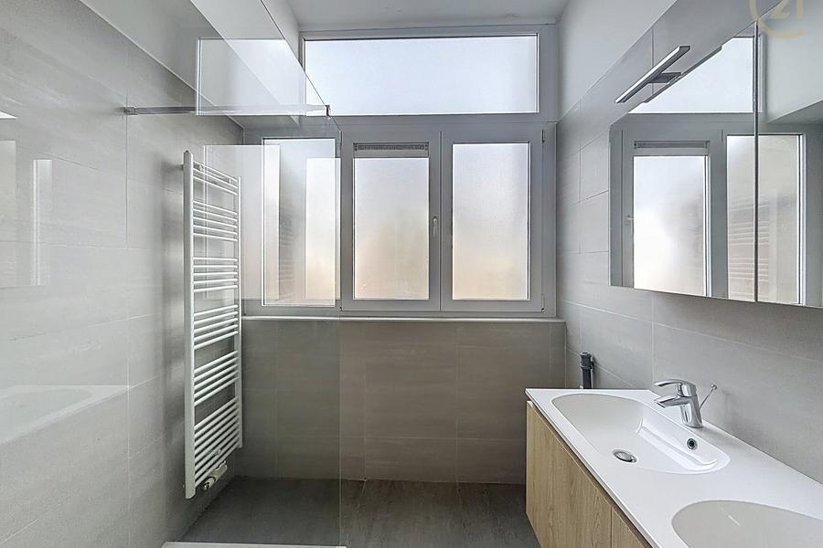 Een hal van 2 m² geeft toegang tot een douchekamer van 4,5 m² (met dubbele wastafel en aansluiting voor een wasmachine) en een apart toilet (1 m²).