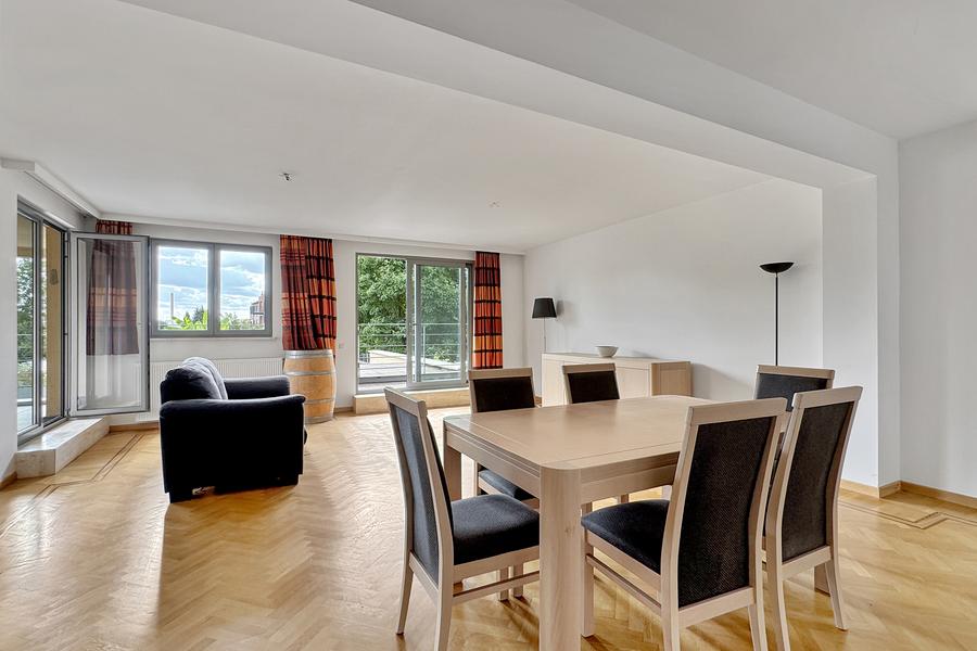 Neder-Over-Heembeek, Lombartzydestraat 184-186: op de 1e verdieping van een klein modern gebouw met lage kosten, prachtig appartement van 130 m² bestaande uit een inkomhal, grote woonkamer (46 m²) met toegang tot het terras op het zuiden (22 m²), ingerichte keuken (17,40 m²), 1 grote slaapkamer (15,70 m²) met eigen douchekamer en toilet (4 m²), nachtgang met 2 slaapkamers (9,90-12,50 m²), badkamer met bad/douche/dubbele wastafel/wasruimte (11 m²), apart toilet met wastafel en kelder in de kelder (9,95 m²). Individuele gasboiler, videofoon, PVC-ramen met dubbele beglazing uit 2009. Informatie en bezichtigingen CENTURY 21 Best House 02 268 21 50