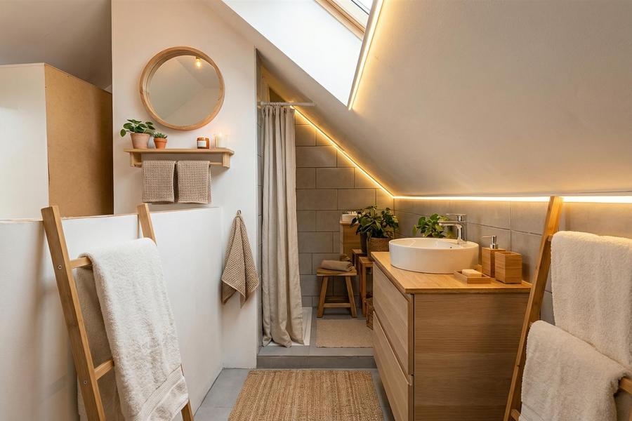 Bij binnenkomst betreedt u de gezellige leefruimte. Via de trap bereikt u de keuken. Vanuit de keuken leidt een tweede trap naar de slaapkamer met aansluitende badkamer.