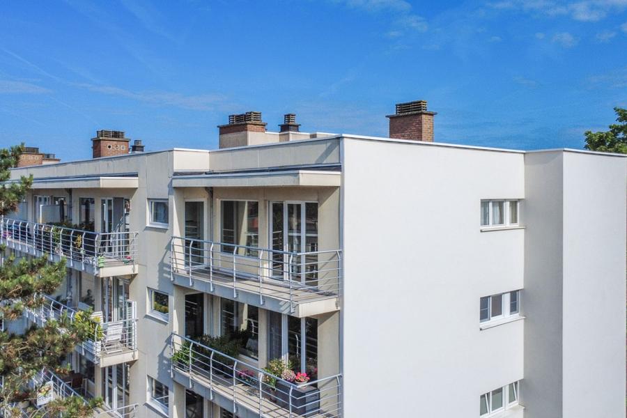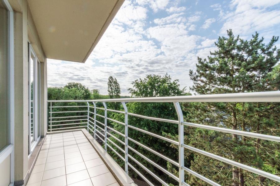 Een ruim (108m²) en zeer aangenaam penthouse-hoekappartement met 3 slaapkamers en 2 panoramische terrassen, een gesloten garagebox en kelder gelegen te Halle (Sint-Rochus), residentie Breugel.