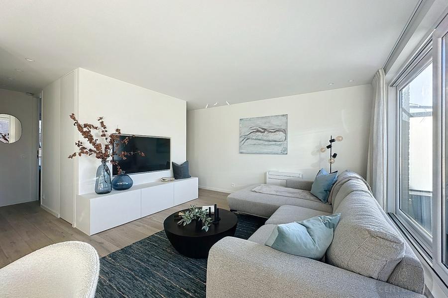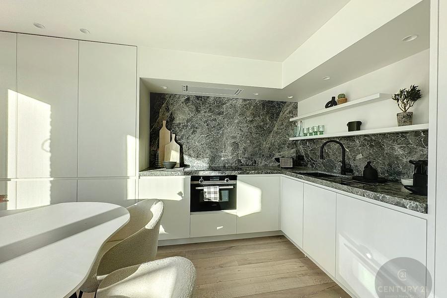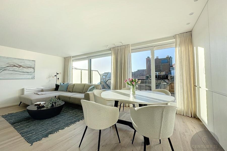 De indeling is als volgt: een inkomhal met gastentoilet, een zeer lichtrijke woonkamer die uitkomt op een fantastisch zonnig terras met zijdelings zeezicht! Een moderne open keuken voorzien van alle toestellen, twee volwaardige slaapkamers, elk met een praktische douchekamer. Beide slaapkamers hebben toegang tot het achterliggende terras waar je 's morgens kan genieten van de eerste zonnestralen! Kelderberging. MEUBILAIR INBEGREPEN!