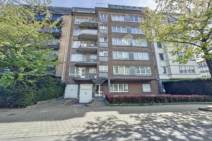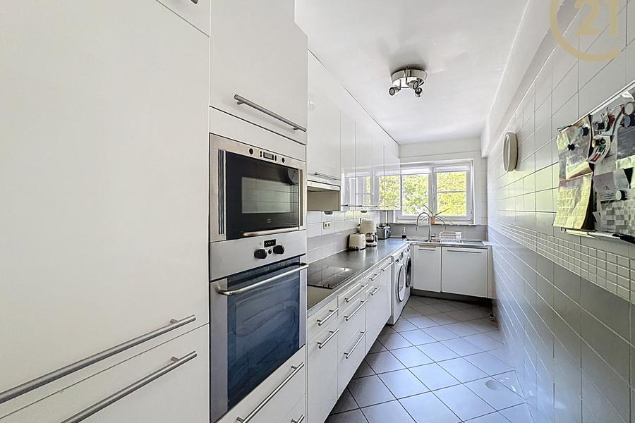 Het appartement is momenteel verhuurd en onderscheidt zich door zijn royale volumes, met een woon- en eetkamer van ongeveer 26 m². De slaapkamers meten respectievelijk ±11 m² en ±12 m², en geven uit op een achterliggend balkon met een bergruimte van ±4,5 m². De ruime, volledig uitgeruste keuken is ±9 m². Het appartement geniet van veel natuurlijk licht en is goed geïsoleerd. Een private kelder is inbegrepen.