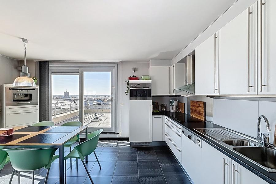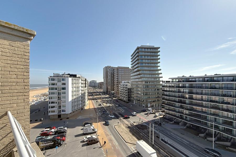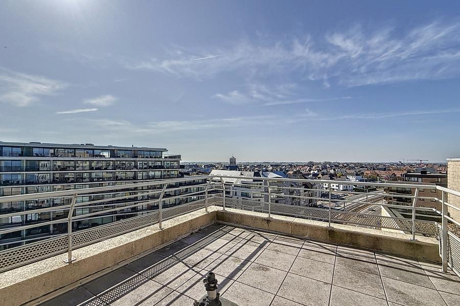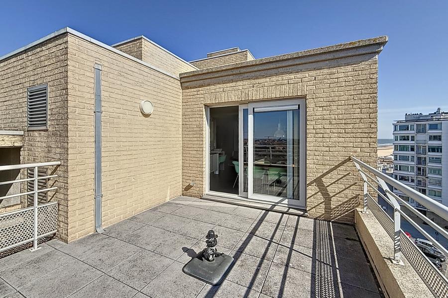 Schitterend en instapklaar dakappartement met twee uitzonderlijke terrassen, centraal gelegen in Oostende op enkele meters van het strand.Indeling: inkomhal met apart toilet, lichtrijke woonkamer met open keuken, terras (exclusief genotsrecht) met panoramisch zicht, twee ruime slaapkamers met toegang tot het tweede terras en ruime berging, badkamer met douche en enkele wastafel. Inclusief kelderberging op niveau -2 en de mogelijkheid tot het aankopen van een enkele garagebox op niveau -2 in het ondergrondse garagecomplex.De residentie beschikt over een gemeenschappelijk zwembad.