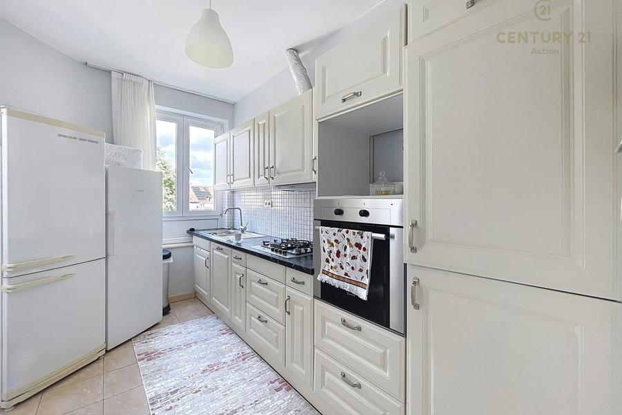 Het appartement bestaat uit een inkomhal, een uitgeruste keuken, twee slaapkamers, een lichte woonkamer van 21 m² en een eetkamer van 16 m².