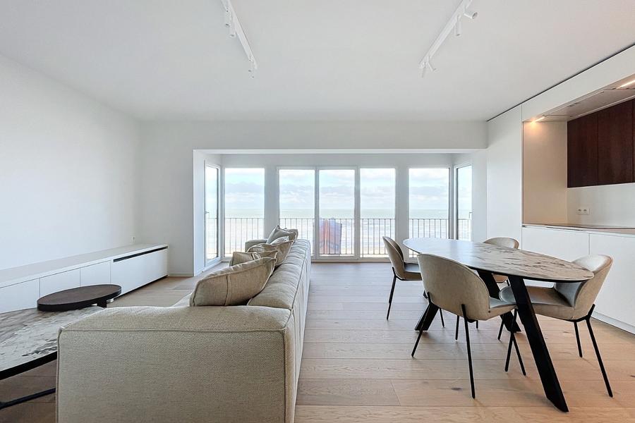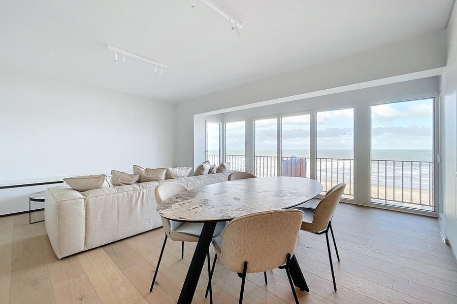 Smaakvol en kwalitatief gerenoveerd appartement op de zeedijk van Sint-Idesbald, vlak bij het centrum. Het appartement ligt op de vijfde verdieping (één appartement per verdiep) en bestaat uit: nkomhal, living met eetkamer, volledig ingerichte keuken, eerste badkamer met douche en wastafel, afzonderlijk toilet, drie slaapkamers waarvan één blinde slaapkamer en één slaapkamer met extra badkamer (toilet, wastafel en douche). Balkon aan achterzijde. Gemeenschappelijke kelder om de fietsen te plaatsen. Mogelijkheid tot aankoop grote garage 10m x 2m70, prijs 93.000 euro. Ref. Jackylene 0501