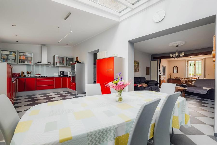 Charmant dorpshuis in Beauraing, dat een aangename en royale leefruimte biedt met ongeveer 259 m² woonoppervlak verdeeld over 2 verdiepingen en een bruikbare zolder. Vanaf het moment dat je binnenkomt, vermengt het karakter van het oude huis zich met modern comfort: een grote, lichte woonkamer met open haard, een eetkamer die uitkomt op een eigentijdse keuken met rode ruitjes en grote ramen die de kamers overspoelen met natuurlijk licht. 4 royale slaapkamers en een functionele badkamer maken de privéruimte op de bovenverdieping compleet; sommige slaapkamers hebben balkenplafonds en antieke details die warmte en karakter toevoegen.