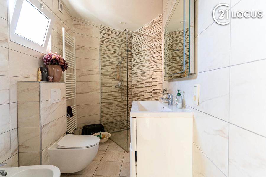 2de verdieping: tweede badkamer met douche en toilet (5 m²) en nog 2 slaapkamers (14 & 9 m²).