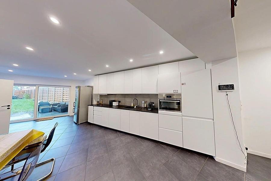 Deze lichtrijke gerenoveerde woning biedt op het gelijkvloers een inkomhal, living, een lichtrijke woonkamer met eetruimte en een volledig ingerichte open keuken met onmiddellijk toegang tot het terras en de tuin, een bijkeuken, een aparte toilette, evenals een inpandige ruime garage (sectionaalpoort). Vanuit de woonkamer heeft u directe toegang tot het zonnig terras en de zuidgerichte, onderhoudsvriendelijke tuin.