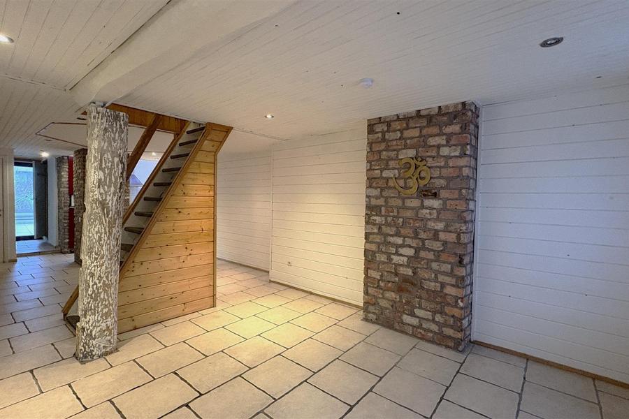 Aansluitend is een grote aanbouw die voorzien is van grote glaspartijen en uitkijkt uit op de tuin.