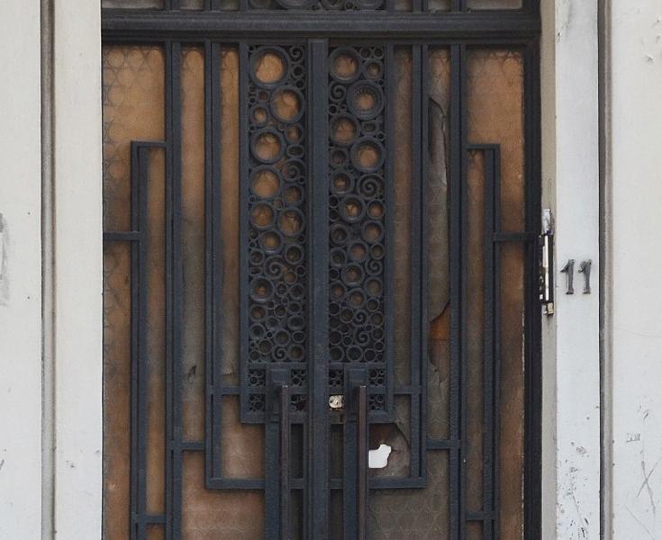 Asymmetrische compositie afgewerkt met witte imitatiesteen. Raamopeningen met getrapte omlijstingen, een inkomdeur onder een balkonnetje dat als luifel fungeert en gekoppelde ramen op het gelijkvloers. Bow-window met gebogen grondplan onder een terras, met gecanneleerde zitting en console vóór een pilaster met torusprofielen. Glazen deur, borstweringen en leuningen in smeedijzer met cirkel- en volutemotieven; metalen stijlen verbinden de elementen van de bow-window.