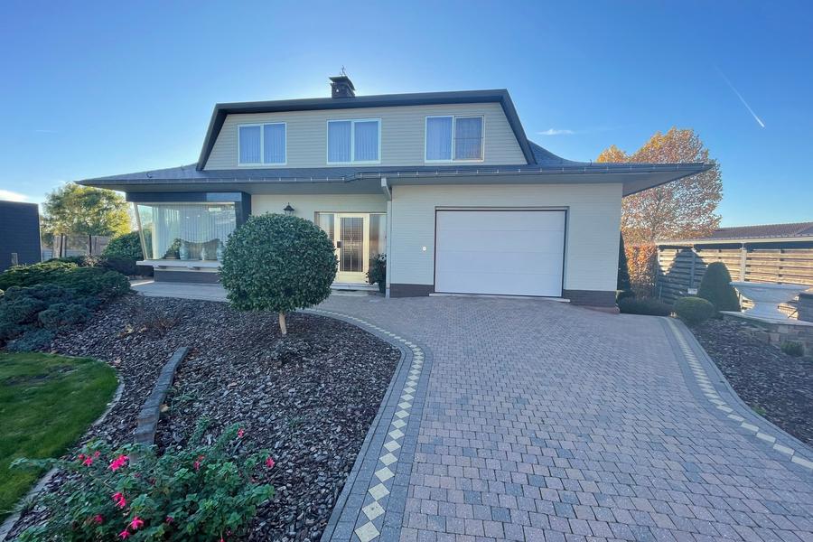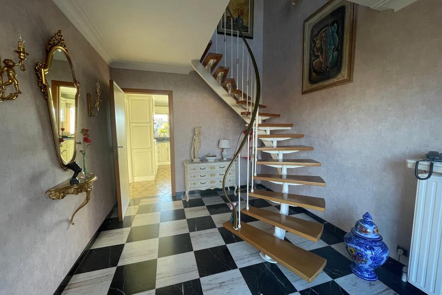 We betreden de woning via een ruime inkomhal. Links bevindt zich de lichtrijke woonkamer met grote raampartijen. Aansluitend ligt de volledig uitgeruste keuken met granieten werkblad, inductiekookplaat, combioven en koelkast – een droom voor elke kookliefhebber. Van hieruit geniet je van een prachtig uitzicht op de aangelegde tuin. Verder vind je op het gelijkvloers een apart toilet, een ruime garage en een stijlvolle badkamer met dubbele lavabo, spiegelkast en douche.