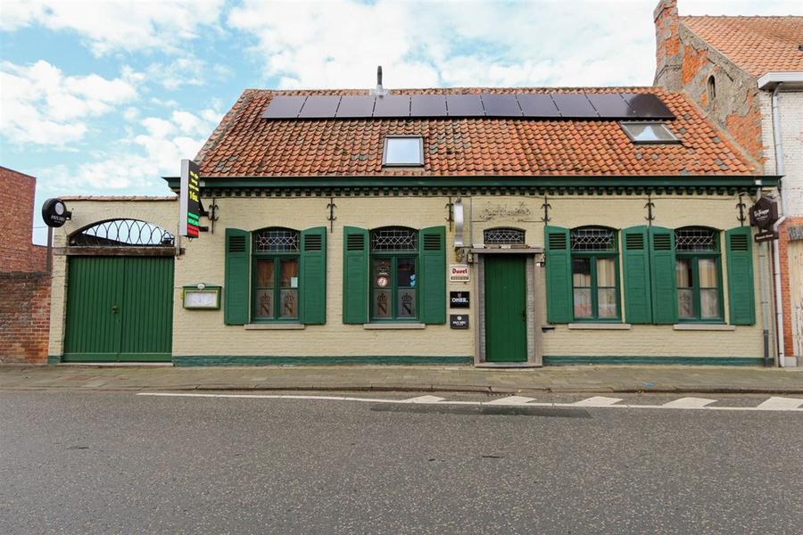 Karaktervolle horecazaak met ruime woonst, gezellige tuin en volledig ingerichte professionele keuken. Dit pand valt meteen op door zijn authentieke gevel met groene luiken, grote poort en zonnepanelen op het dak — een charmant gebouw met uitstraling.