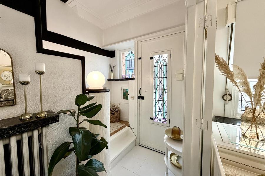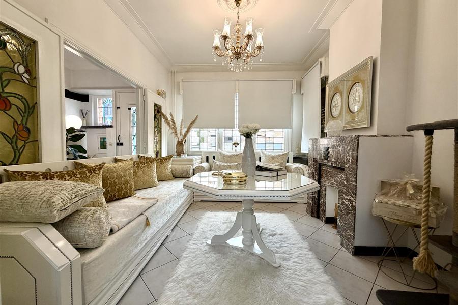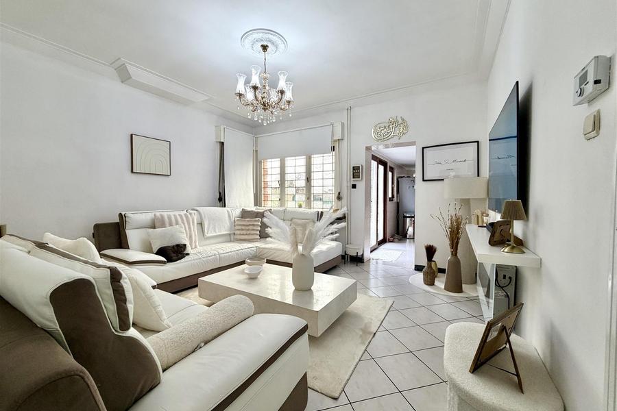 Bij het betreden van de woning komt u terecht in een ruime dubbele woonkamer die baadt in het daglicht. De vele raampartijen, waaronder authentieke glas-in-loodramen, zorgen voor een warme en charismatische uitstraling. Aansluitend vindt u de volledig gerenoveerde keuken, praktisch ingericht en perfect onderhouden, alsook een apart toilet.
